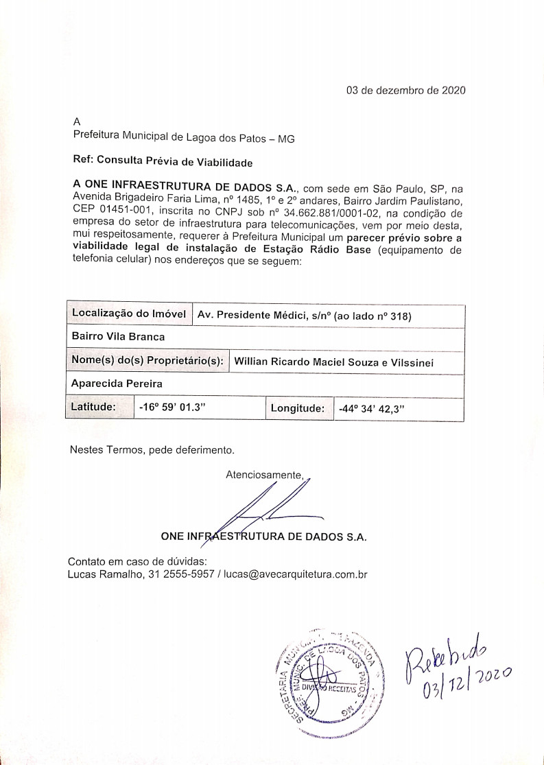 A prefeitura no intuito de acelerar o processo de implantação de uma nova rede de telefonia celular (TIM) no município, aguarda brevemente o pedido de viabilidade da empresa ONE INFRAESTRUTURA DE DADOS S.A, para que possa dar continuidade dos processos para melhor conforto da população.